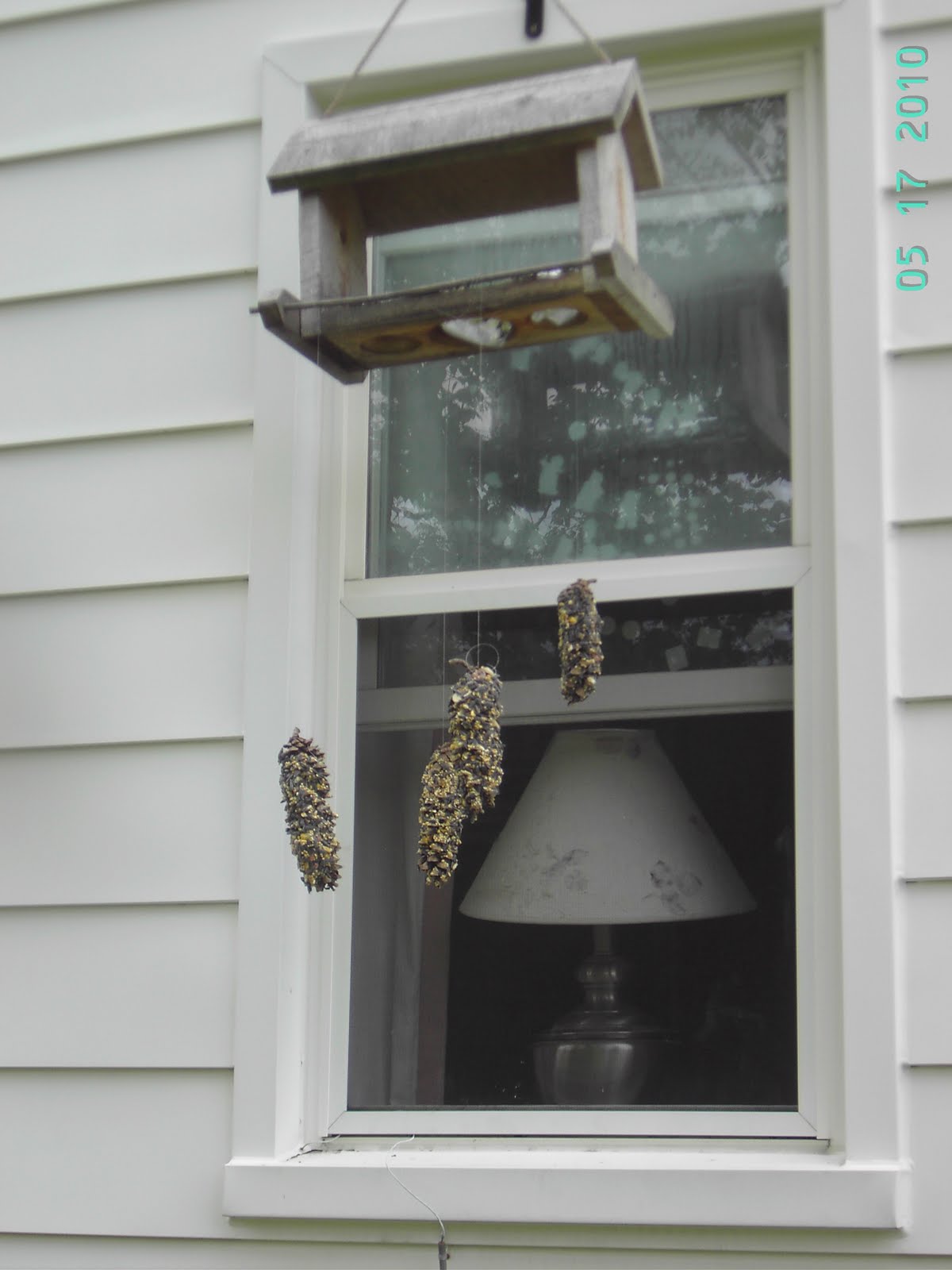 They are pine cone feeders. I saw the idea on Disney Channel and again recently on someone’s blog. You take pine cones, cover them with peanut butter and roll them in bird seed. Last weekend when we visited my family, Granny and Papa gave us pine cones. I finally got bird seed last night. Put it all together with some fishing line, and here is what they created.