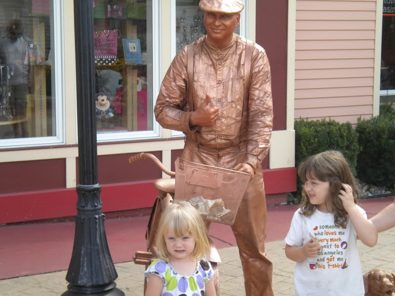 This is a live statue.  The girls want to know how he gets the paint off his body…