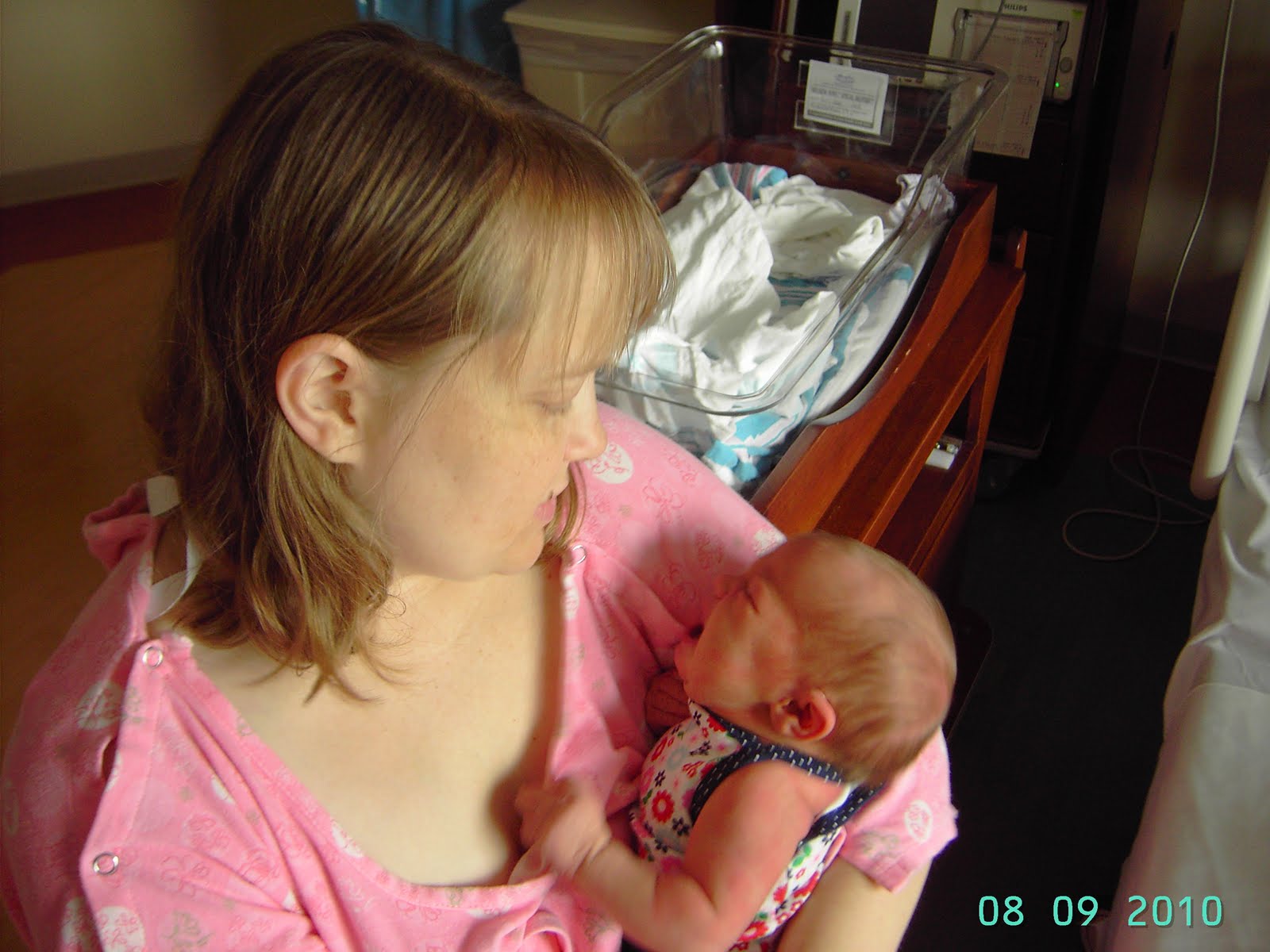Then I started begging for help again. And yelling at hubby and my midwife. I remember hearing my midwife ask hubby what the sta-dol had done for me during labor with Sue. He explained that it did not noticably take any pain, but allowed me to relax in between contractions just a bit. So she asked me if I wanted something in my IV. At my agreement we started the process of getting out of the tub and across the room. We had to stop several times as I got hit by contraction after contraction. Even once I got laid down, I had to tell my midwife to wait before checking me, as I worked to get through each one as it came.